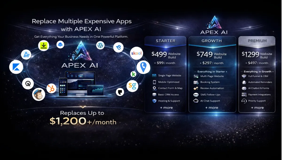 APEX AI helps businesses grow by building high-converting websites, automating operations, and implementing AI tools to capture leads, follow up with customers, and streamline everyday tasks — all in one platform.